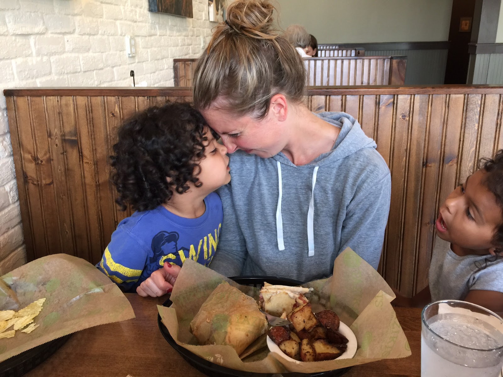| Apparently this is how wolf mommies and babies give kisses. You can see my fantastic meal in front of me. Grilled lamb wrap with roasted potatoes...YUMMY, we will definitely be going back to Tazikis again...about 10 minutes from the Lodge. |